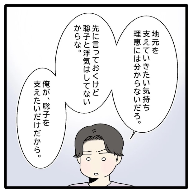 私の考えていることがわかったのか、「地元を支えていきたいって気持ち、理恵には分からないだろ。先に言っておくけど、聡子と浮気はしてないからな。俺が、聡子を支えたいだけだから」と改めて浮気を否定する正志。