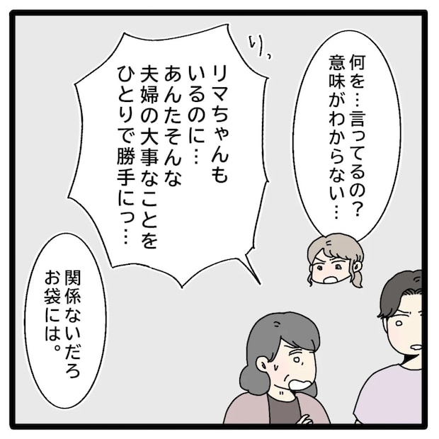 「何を・・言ってるの?意味がわからない・・」突然の展開に理解が追い付かない私。義母が「りっ、リマちゃんもいるのに・・あんたそんな夫婦の大事なことをひとりで勝手にっ・・」と正志を咎めますが、「関係ないだろ、お袋には」と聞く耳を持たない正志。