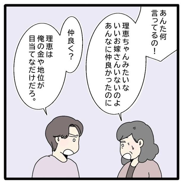 夫婦の絆よりも幼なじみの絆をとった正志さん。それだけでもショックなのに、「お金や地位が目当てなだけ」なんて酷すぎます。正志さんは人が変わってしまったようですね。