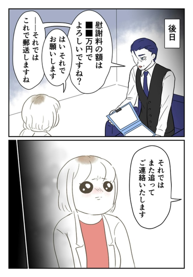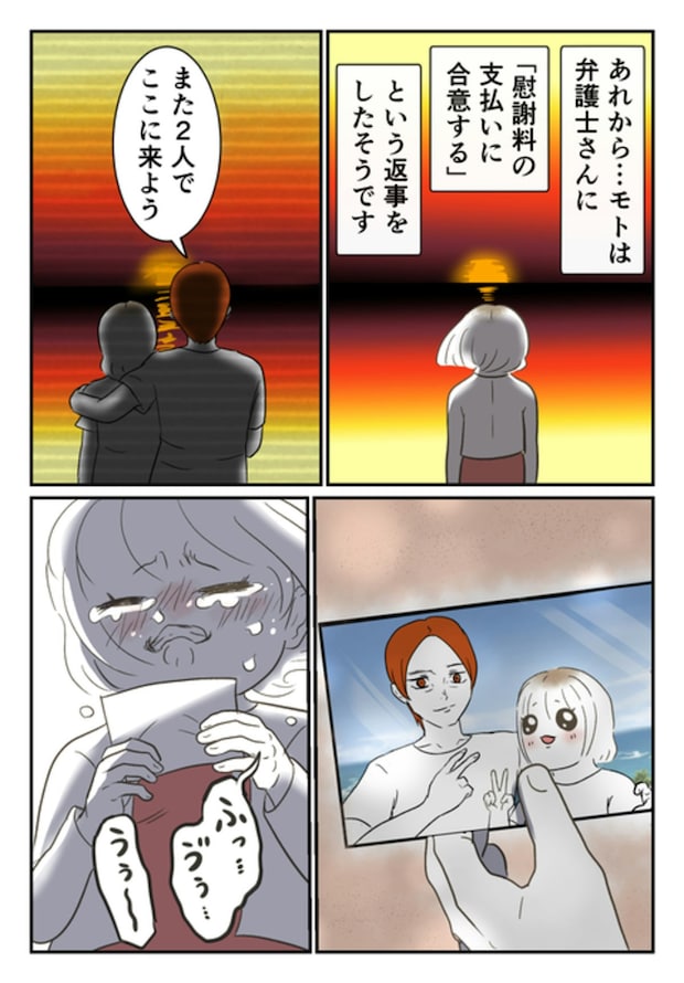 その後、モトさんが慰謝料の支払いに合意したことを知らされます。さまざまな思い出がよみがえり、2人で撮った写真を手に、こらえていた涙が再びあふれ出します…。