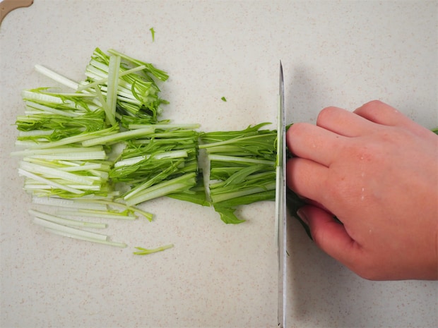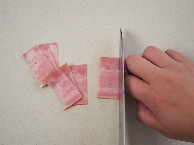 2. ベーコンは2cm幅、水菜は3cm長さに切る。