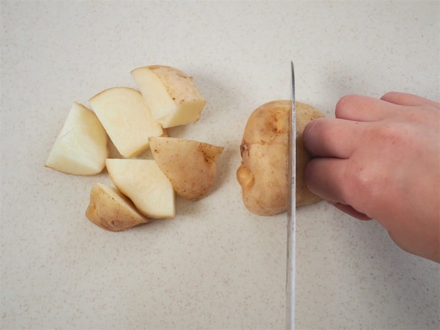 ①緑色に変色していたり、芽が出ていたりするじゃがいもはその部分を含めて大きめに取り除きます。全体に緑色だったりあちこち芽が出ていたりする場合は、食べないようにしましょう。