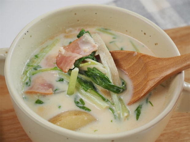 また、じゃがいもはほくほく、ごぼうはシャキっと香り立ち、水菜のほろ苦さが全体を引き締めてくれます。ベーコンもコンソメスープのように、旨味がしっかり残っているのが印象的でした!