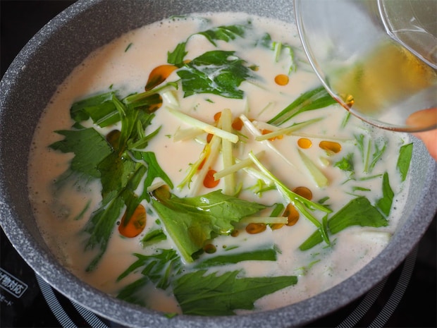 5. 仕上げに水菜とゴマ油を加え、火を止めて完成。