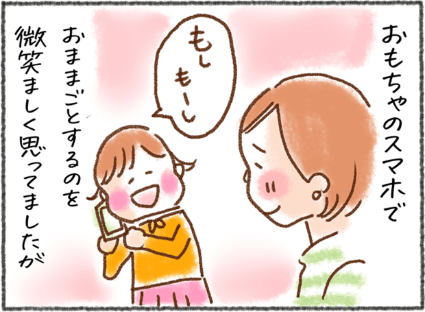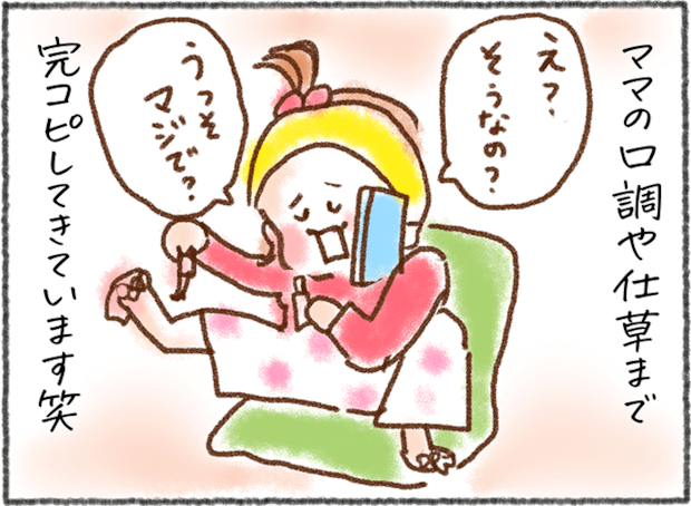 3歳の娘ちゃんは、なんでもママと同じことをやってみたいという好奇心旺盛なお年頃。最初はおもちゃのスマートフォンでかわいくまねっこしていたかと思うと、そのクオリティはどんどん進化していき、ついにママの口調やしぐさまで完全にコピーしてきたそうです。 保育園で同じことをしているかもと、ママさんはヒヤヒヤなのだとか。子どもの観察眼は侮れませんね。