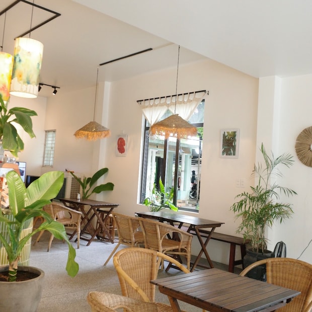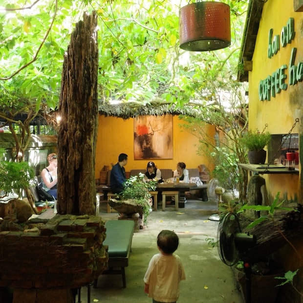 ベトナムはクーラーがないお店も多いのですが、ここは緑に囲まれ木漏れ日と扇風機で心地よかったです。アイスラテはなんと250円!
