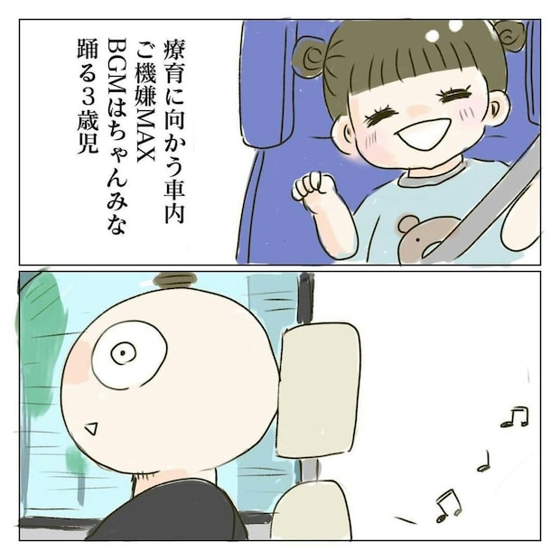 剥がれ鱗さんは、娘のぴぴちゃんを療育に連れて行きました。車の中では、ぴぴちゃんはとてもご機嫌で、楽しそうに過ごしていました。