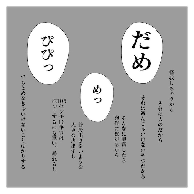 ぴぴちゃんは、泣き叫びながら療育の教室から逃げ出そうとしました。剥がれ鱗さんは、ぴぴちゃんがてんかんの発作を起こさないか心配しました。