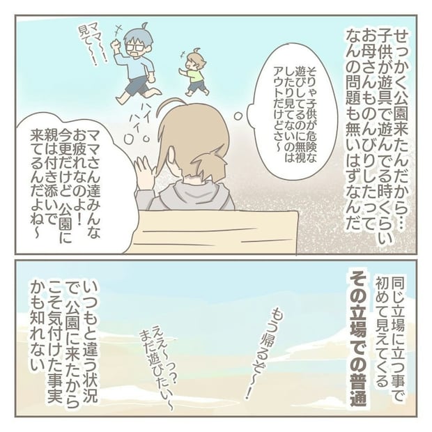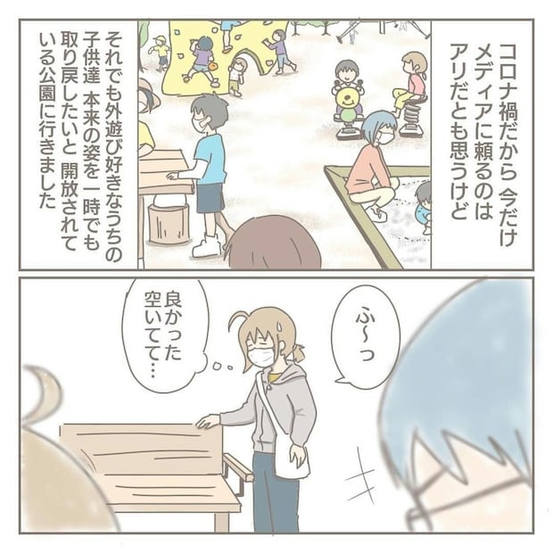 久しぶりに公園で体を動かす子どもたち。その間にスマホを取り出しハッとするヨカさん。コロナ禍の前後で、親への考え方が柔軟になったと自覚するのでした。