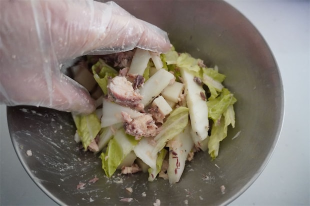 全体をふんわりとよく和えます。サバの身が崩れ過ぎないように気をつけて!