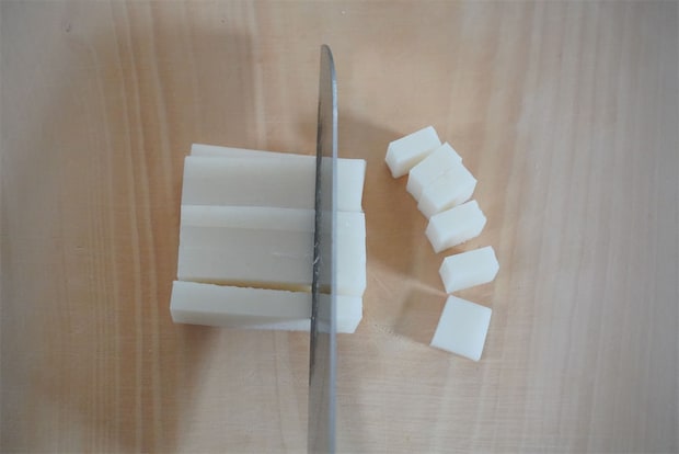 1. 白菜は葉と軸に切り分けて縦3等分に切り、2cm幅の斜め切りにする。餅は5mm厚さに切って1cm幅に切る。サバ缶は汁気を切る。