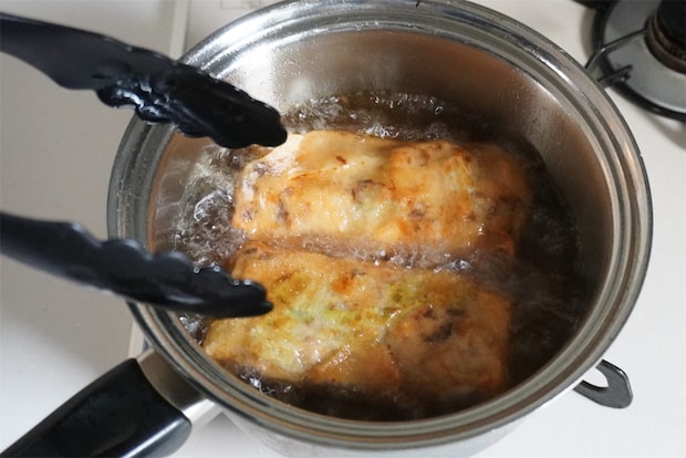 4. 揚げ油を170℃に熱し、きつね色になるまで両面を揚げて塩をふる。