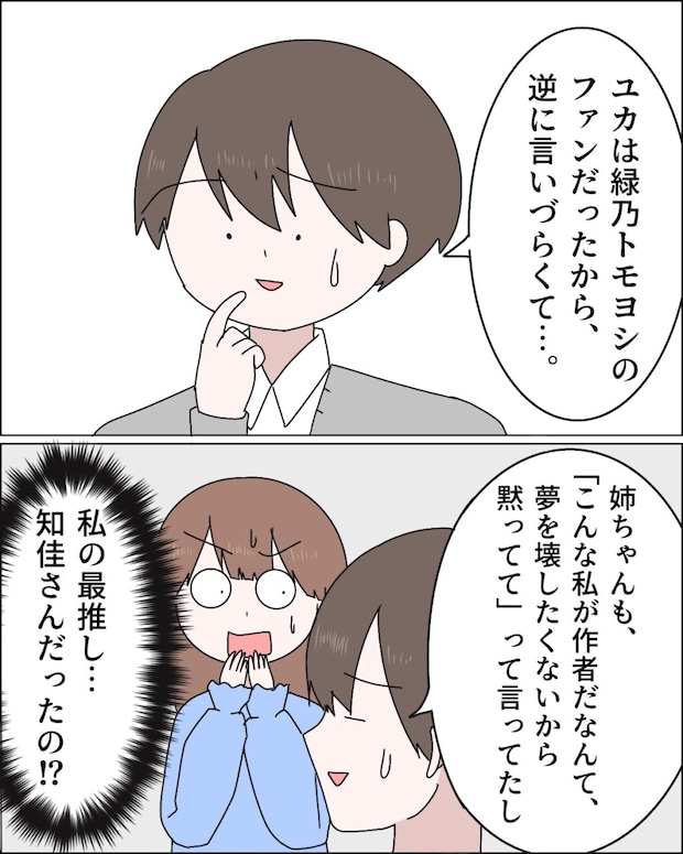 「ユカは緑乃トモヨシのファンだったから逆に言いづらくて・・・姉ちゃんも『こんな私が作者だなんて、夢を壊したくないから黙ってて』って言ってたし」そう打ち明ける康太。私の最推しである緑乃トモヨシが、まさか知佳さんだったなんて。いまだに信じられませんが、身内である康太がそう言うなら間違いないのでしょう。