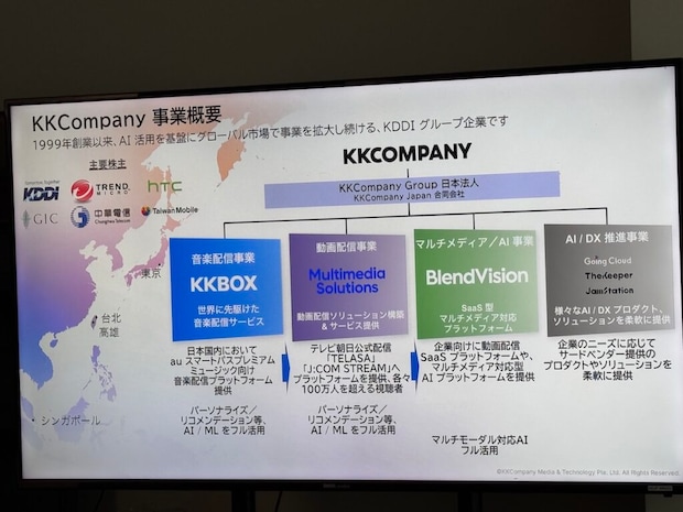 KKCompanyは音楽配信、映像配信、SaaSプロダクト、AIプラットフォームの4事業を展開している。特にAIプラットフォーム事業では、音声・テキストに加え、映像・動画を扱えるマルチモーダルAIに注力しており、企業の多様なニーズに応えるソリューションを提供している。