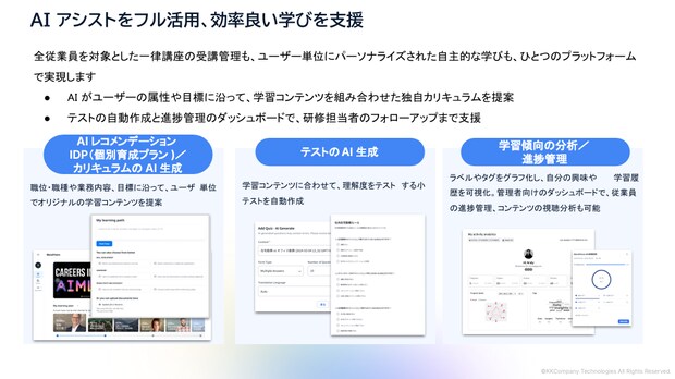 KKCompanyは台湾・シンガポール・日本を拠点とするAIマルチメディアテクノロジーグループであり、これまで企業内に蓄積される会議動画、研修動画、マニュアル、ドキュメント、さらには従業員の形式知・暗黙知を“知の資産”として共有・活用する仕組みを提供してきた。今回の新サービスは、同社が得意とする動画技術とAI活用技術を融合し、社員の知見習得とスキルアップを支援するものである。