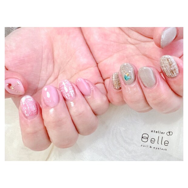 今回は、やわらかなピンクとグレージュのネイルカラーをベースに、ハートのペンダントモチーフを取り入れた上品なツイードネイルデザインをご紹介いたします。