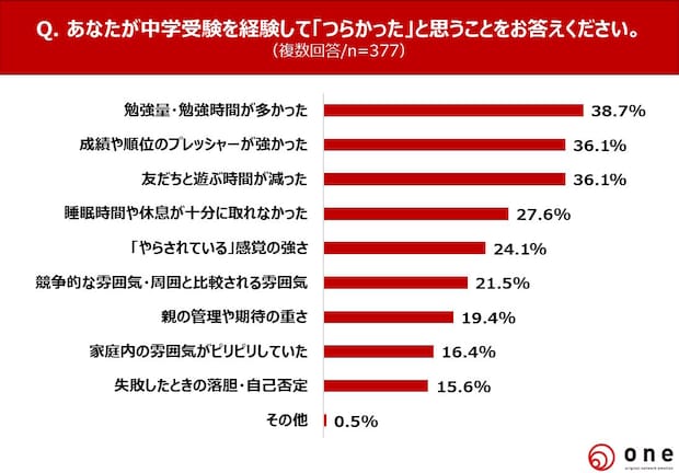 中学受験を経験してつらかったことで最も多かったことは、「勉強量・勉強時間が多かった」(38.7%)でした。以下、同率で「成績や順位のプレッシャーが強かった」「友だちと遊ぶ時間が減った」(各36.1%)が続いています。「睡眠時間・休息が十分に取れなかった」「『やらされている感覚』の強さ」などの回答も多く挙がっています。