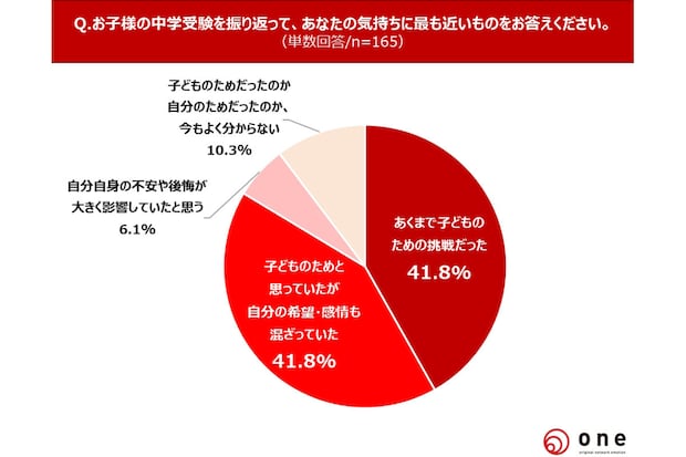 子どもが中学受験をした人に、当時を振り返って今の自身の気持ちを聞くと、「あくまで子どものための挑戦だった」と「子どものためと思っていたが自分の希望・感情も混ざっていた」が同率41.8%となりました。