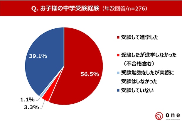 子どもの中学受験経験について聞くと、「受験して進学した」が56.5%、「受験したが進学しなかった(不合格含む)」が3.3%でした。