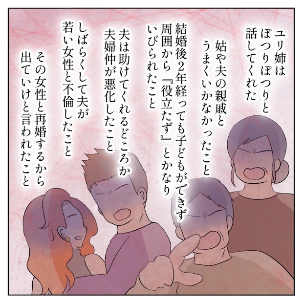 ユリ姉と元夫は3年前に結婚したそう。はじめこそ幸せだったものの、姑や夫の親戚と折り合いが悪く、次第に居場所を失っていったと言います。結婚から2年経った頃には、子どもができないことを理由に、姑や親戚から「役立たず」と罵られ、心ない言葉を浴びせられる日々。夫は守ってくれるどころか、同調してユリ姉を責め立てたそうです。しばらくして夫が若い女性と不倫。その女性と一緒に暮らすからと、ユリ姉は家から追い出されてしまいました。