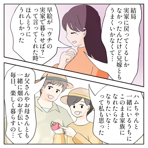 ある日、パートに行くために2人の息子を実家に預けに来た姉早絵さんから「ユリが離婚して戻ってきた」と聞いて公輔さんはドキッとします。早絵さんの学生時代からの友人ユリさんは、公輔さんの初恋の人。結婚して地元を離れていましたが、夫に新しい女性ができてしまったことで家を追い出されてしまったそうです。彼女のことを気の毒に思った公輔さんたち家族は、ユリさんに農家の手伝いをしてもらえないか交渉します。ユリさんは二つ返事で承諾。はじめは遠慮がちだったユリさんでしたが、数ヶ月経つ頃には慣れて、以前より笑顔が増えていったのでした。そんな時、公輔さんは家族の猛プッシュもあり、日頃のお礼と称し、ユリさんを思い切ってデートに誘います。しかし、海を前にしたら気持ちが高ぶったのか、まだ付き合ってもいないのにプロポーズをしてしまいます。ユリさんから「私も好き」という返事をもらえましたが、「ハムちゃんとは結婚できない」と言われてしまいショックを受けました。その日の夜、早絵さんから急に呼び出された公輔さん。慌てて早絵さんの家に向かうと、そこにはユリさんの姿がありました。