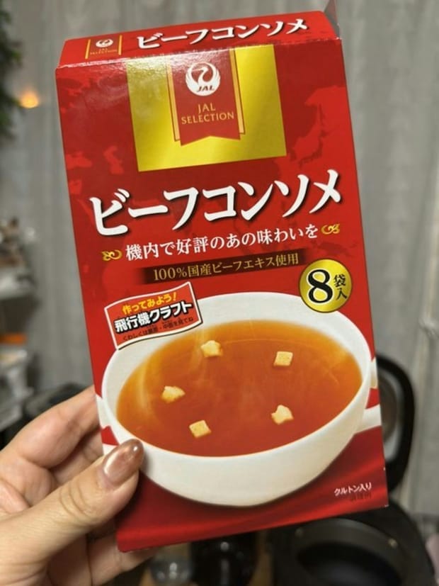 手にしていたのは、なんと「機内で好評のあの味わいを」と書かれたビーフコンソメ(8袋入り)。子どもは、「14000円払わないと飲めないものがさんきゅっぱで!!」と興奮気味。お母さんは完全に息子さんの言葉の勢いに負けちゃいました。機内のスープが家で手軽に飲めるって言われたら、もうこれは買うしかないですよね。