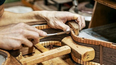 ヤイリギターの工場では、職人の手で一本一本丁寧にギターが作られています。