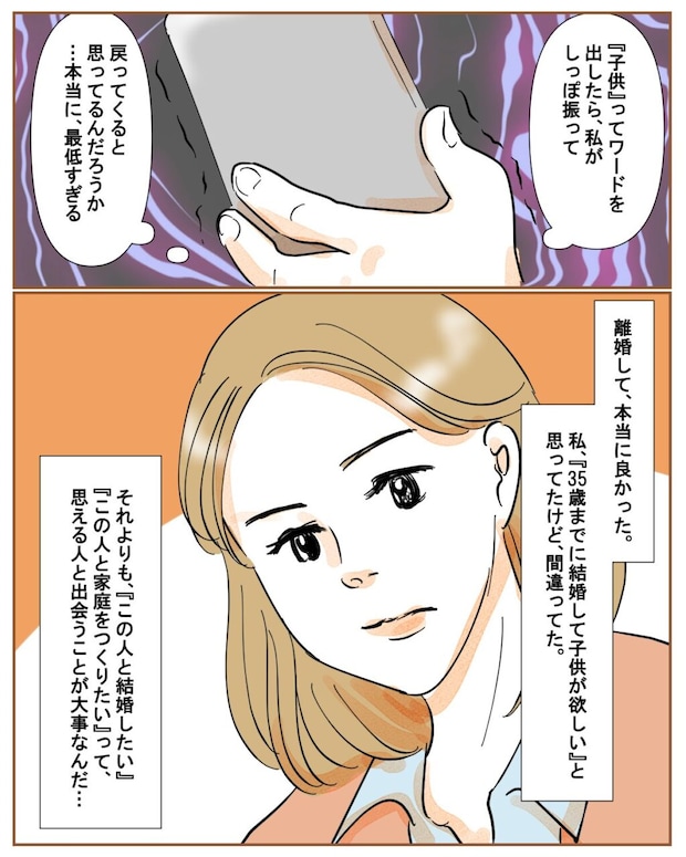 『子ども』というワードを出したら、私がしっぽを振って戻ってくると思ったのでしょうか。考えが浅はかすぎます。離婚して本当によかった。35歳までに結婚して子どもが欲しいと思ってたけど、それは間違いでした。それよりも『この人と結婚したい』『この人と家庭をつくりたい』って思える人と出会うことが大事なんだと、和也と別れた今、思いました。
