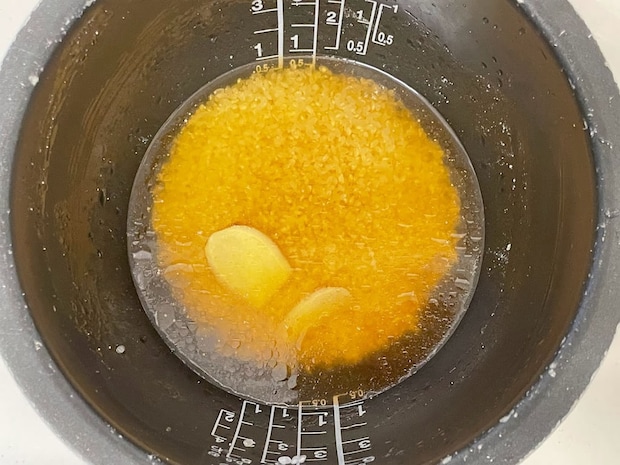 1. 炊飯釜に米と調味料を入れ、2合の目盛りより少なめに水を入れる。