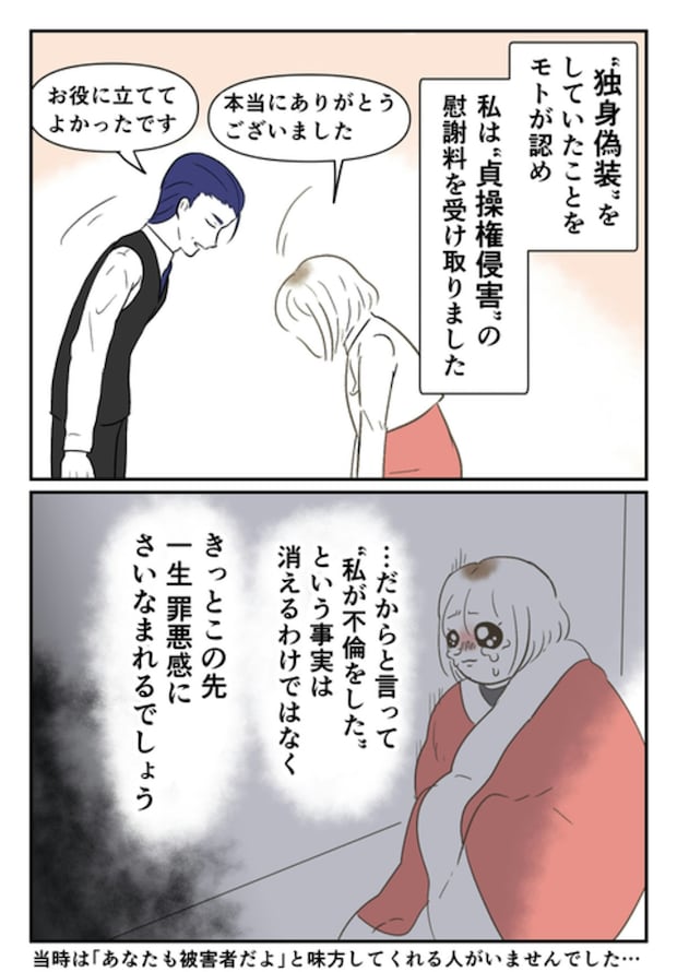 モトさんは「独身偽装」をしていたことを認め、尾持さんは「貞操権侵害」の慰謝料を受けました。しかし、知らなかったとはいえ、不倫をした事実はその後も尾持さんの心に、深い罪悪感を植え付けました…。
