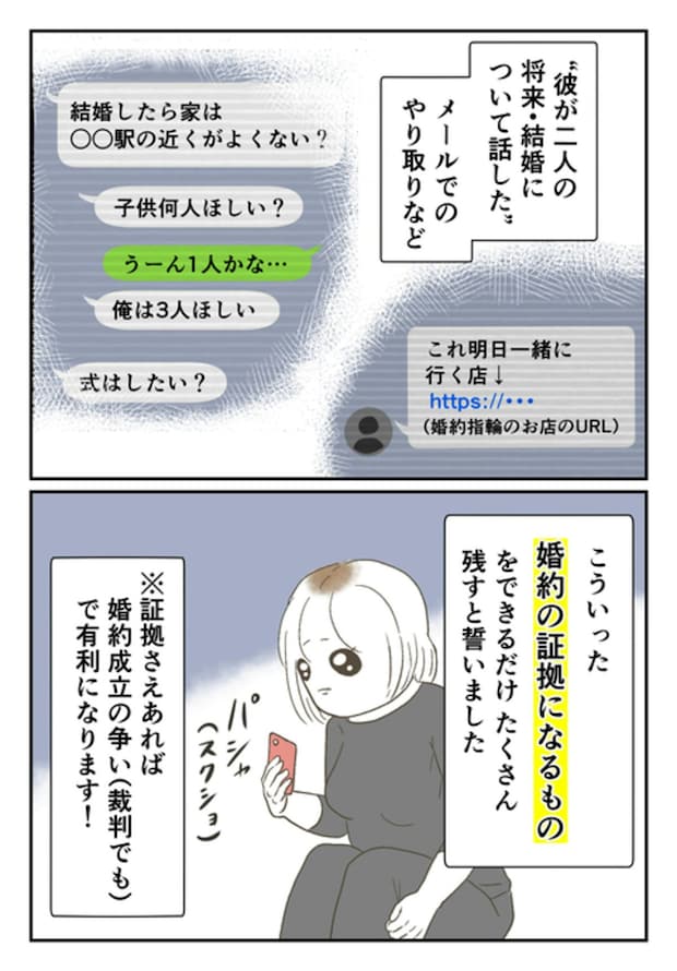 万が一に備え、結婚の約束ややり取りについても、スクショをしたり、保存をしたりすることが、裁判などで有利になると尾持さんは漫画を通して伝えています。