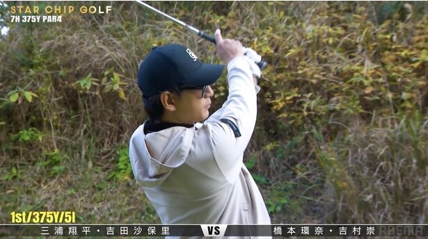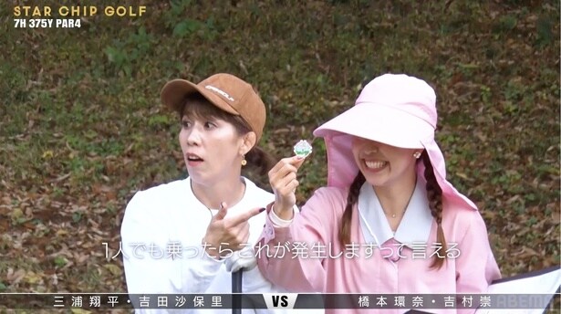 #2では、#1に続き、最大賞金220万円を懸け、三浦翔平&吉田沙保里ペアと、吉村崇&橋本環奈ペアが白熱のゴルフ対決。迎えた7番ホール、三浦が5番アイアンで放った打球は、ピン真っ直ぐに飛び出すと、想定を遥かに超える飛距離を記録。アイアンとは思えない驚異的な伸びに、橋本が「すごーい!」と大歓声を上げる中、対戦相手の吉村は「なに使ってるの?」「それ脱法クラブじゃないの?」「違法クラブ?」とツッコんだ。