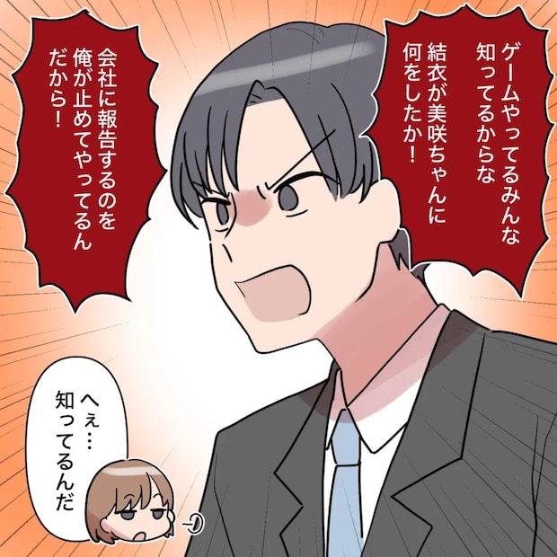 そして、「ゲームやってるみんな知ってるからな。結衣が美咲ちゃんに何をしたか!会社に報告するのを俺が止めてやってるんだから!」と怒鳴りだす和真。「へぇ・・知ってるんだ」呆れてため息をつきながら呟く私に、