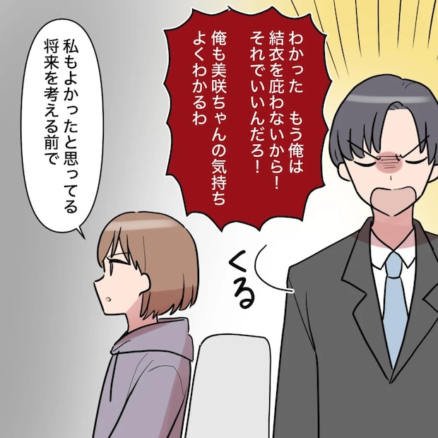 「わかった。もう俺は結衣を庇わないから!それでいいんだろ!俺も美咲ちゃんの気持ちよくわかるわ」そう言い捨てて部屋を出て行こうとします。私はそんな和真に、「私もよかったと思ってる。将来を考える前で」と静かにそう告げました。