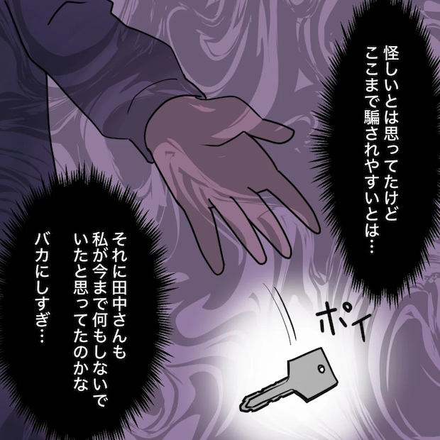 「怪しいとは思ってたけど、ここまで騙されやすいとは・・。それに田中さんも、私が今まで何もしないでいたと思ってたのかな。バカにしすぎ・・」心の中でそう呟きながら、部屋の鍵を捨て、とっとと家を出ました。