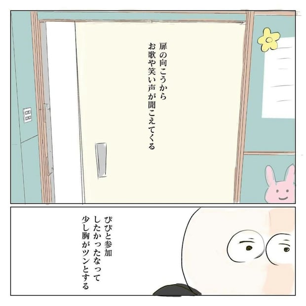別の教室からは歌や笑い声が楽しそうに聞こえてきました。それを耳にした剥がれ鱗さんは、自分たちもみんなと一緒に過ごせたらよかったのにと感じました。