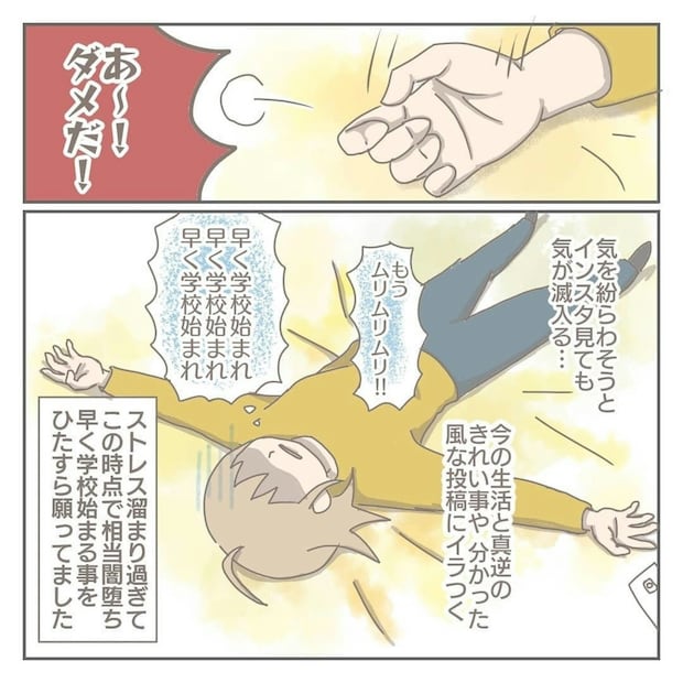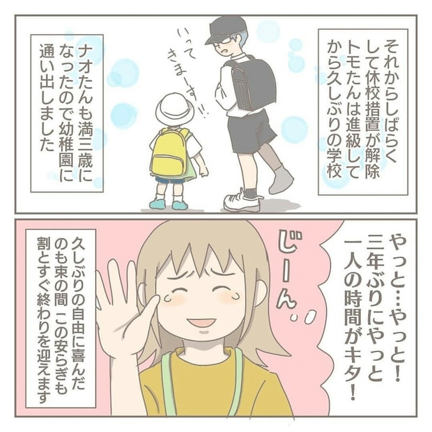 ストレスに限界を感じる日々…。そんな地獄のような日々もようやく終わりを迎えます。休校措置が解除され、トモたんは学校へ。そして、次男のナオたんも幼稚園に通うことに。これで平穏は日々がやってくるのでしょうか。