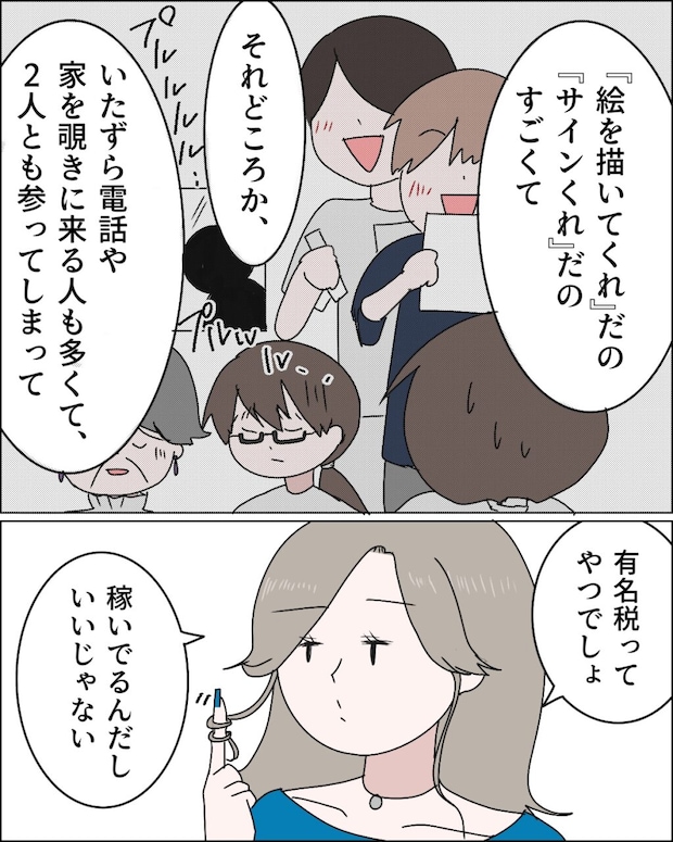 有名漫画家が住んでいると知れ渡ると、ファンの人たちが「絵を描いてくれ」「サインがほしい」と言って、無理やり家に押しかけてきたそうです。それだけでなく、いたずら電話や家を覗きに来る人まで現れて、2人は心身ともに追い詰められていきました。すると、その話を聞いた麻里さんは「有名税ってやつでしょ、稼いでるんだしいいじゃない」と何てことないように言いました。