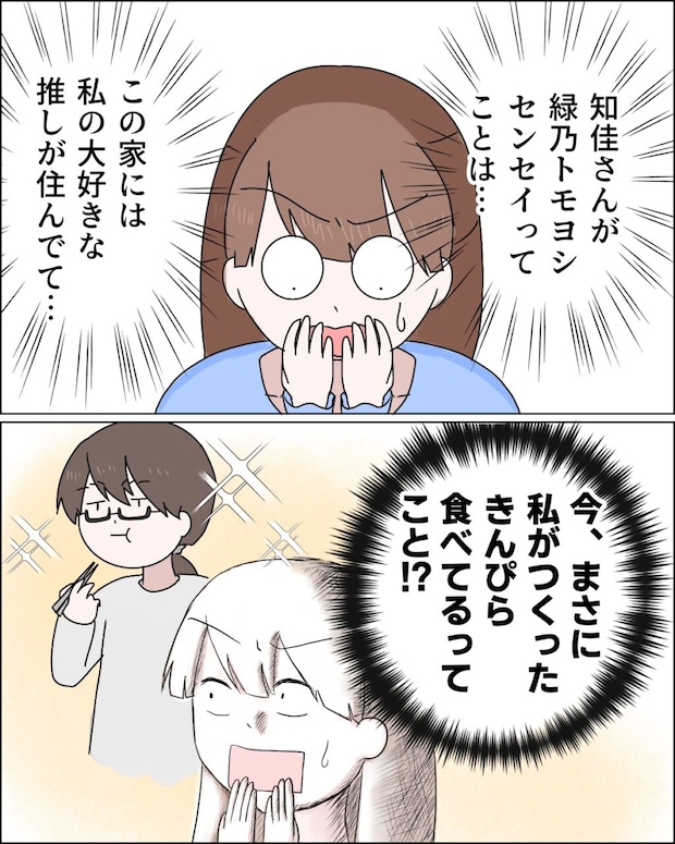 ちなみに私はというと、あまりの展開に頭が追いつかず、いまだ状況を整理できずにいました。知佳さんが緑乃トモヨシ先生ってことは、この家には私の大好きな推しが住んでいて・・・今まさに、私が作ったきんぴらを食べてるってこと!?