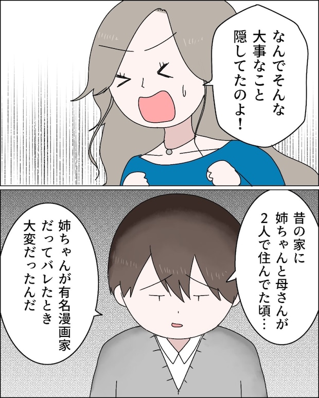康太から、知佳さんが売れっ子漫画家だと聞かされた麻里さんは、「なんでそんな大事なこと隠してたのよ!」と声を荒らげます。すると康太は、「昔の家に、姉ちゃんと母さんが2人で住んでた頃、姉ちゃんが有名漫画家だってバレたとき大変だったんだ」と過去の出来事を話し始めました。