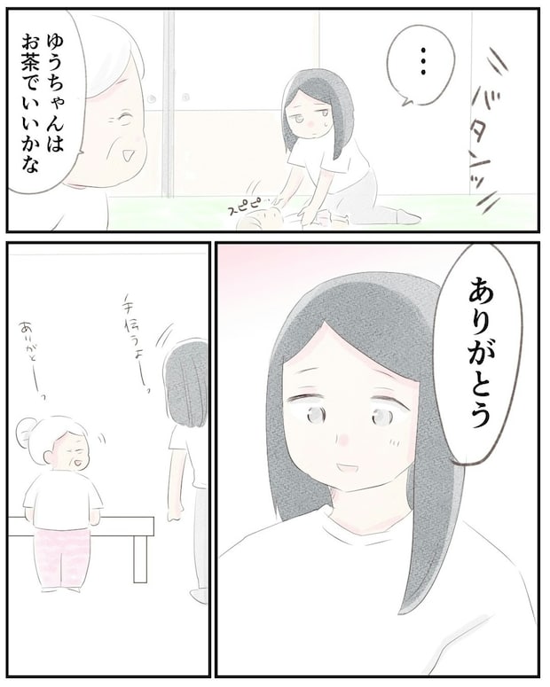 祖母の家に遊びに来たゆうさん一家。お菓子がなくなったので、夫が娘と一緒に近くのコンビニに買いに行ってくれることに。夫が出かけたタイミングを見計らい、ゆうさんは祖母に「聞いてほしいことがある」と話しかけます。