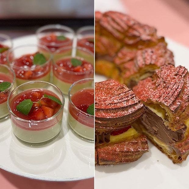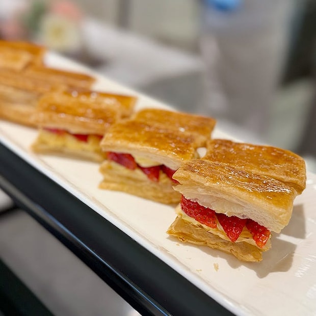 パイはとにかくパリパリで、こんなに軽い食感のパイ、食べたことがないかも! そして、甘酸っぱいいちごとカスタートクリームがマッチします。できたてをいただけるって、やっぱり最強ですよね。
