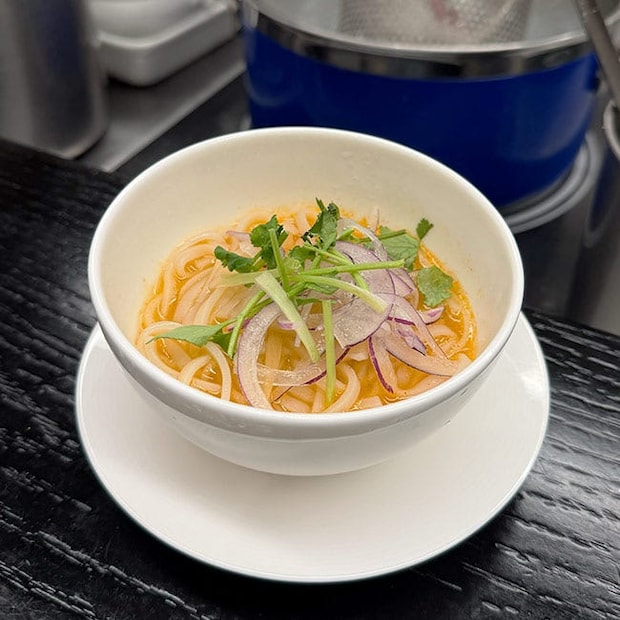 「トムヤムヌードル」を持っていきましょう。シェフがお鍋の蓋を開けた瞬間に、トムヤムクンのいい香りがして、ライブキッチンのよさを改めて感じます。