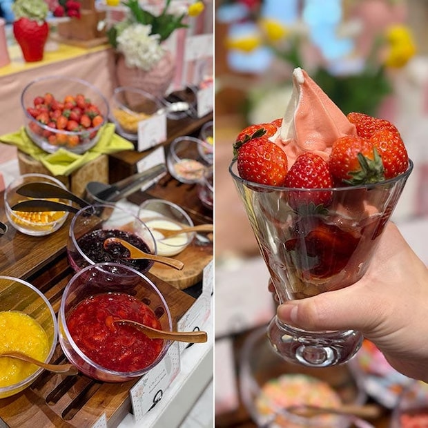 今回とっても楽しみにしているスイーツがあるんです。それが「クラフトパフェ」。カスタマイズを楽しめるメニューで、フレッシュないちごはもちろん、ソフトクリーム、豊富なトッピングなどが並んでいます。自分好みのパフェを作れるって、最高じゃないですか?