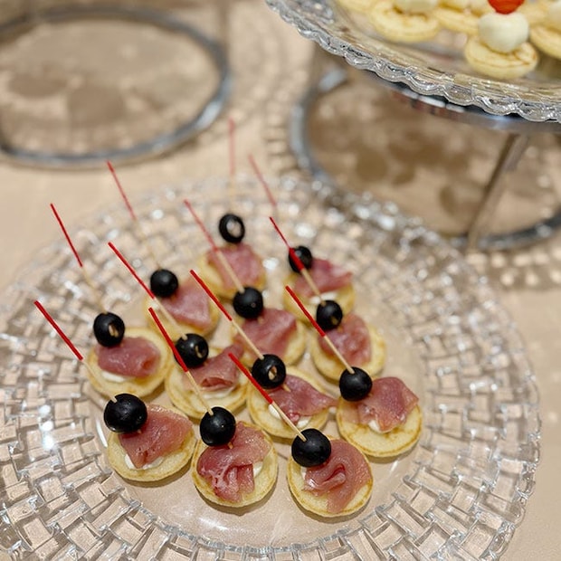 それでは、前菜をいただきましょう。「選べるピンチョスブリニ」は、3種類用意されていました。旨みのある塩気が効いた生ハム、トマトソースで味わうエビ、トマトとチーズを組み合わせたピンチョス、どれもおいしかったです。