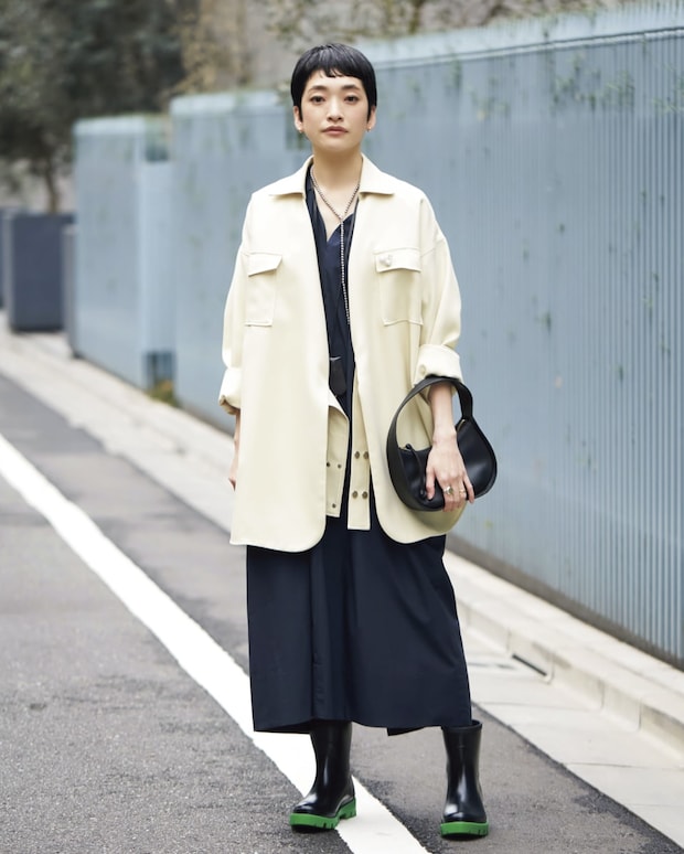 ジャケットにドレスという一見キレイめなコーディネートを、プレイフルなラバーシューズでハズした大人カジュアル。遊び心がきいたギャップのある小物使いが着こなしの鍵に。
