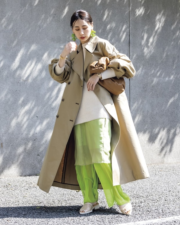 旬のシアー素材×ネオンカラーのパンツをポイントにしたコーデは、パンツのシアー感を生かしつつも、スカートをレイヤードして透け感をセーブ。ベージュ系トーンになじむ、大人の着こなしに。