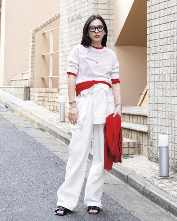 ニットのレイヤードやコンビネゾンのパンツばき、バイカラー使いなど、立体感のある着こなしが目を引く山野邉さん。足元はブーム再燃中のヒールサンダルでアップデート&スタイルアップ。
