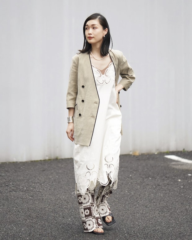 レースのドレスにどこか懐かしいプリントパンツのミックスレイヤードがお似合いの市川さん。キレイめジャケットやソリッドなジュエリー、ヒールサンダルを合わせてモダンさをキープ。
