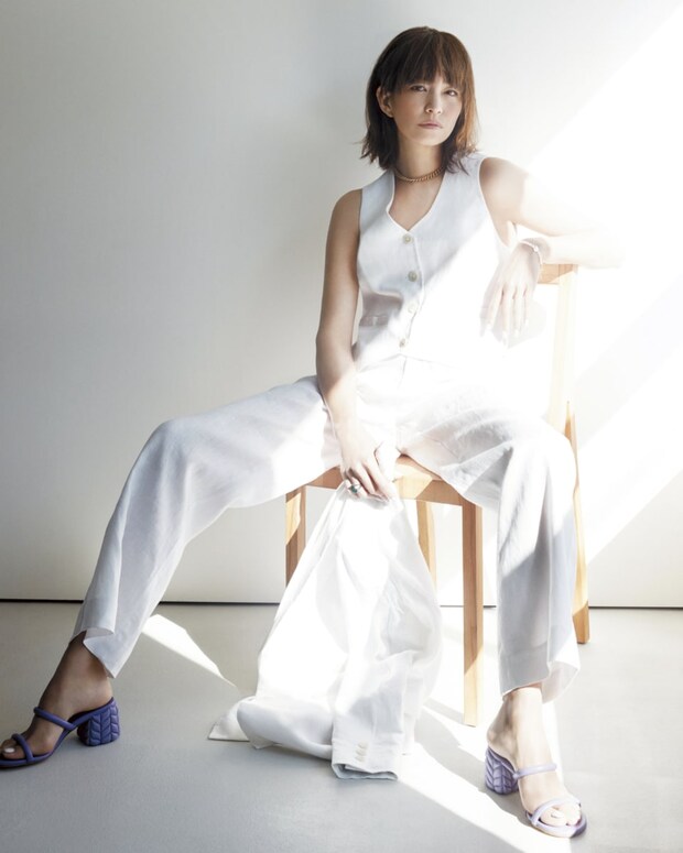 「慣れ親しんだオーバーサイズではなく、ジャストサイズ。Tシャツやシャツを入れずとも一枚で着られるサイジングが鮮度の決め手。Y2Kには、90年代後半のムードが色濃く反映されているんですよね。なので、こんなふうにパンツとのセットアップやスーツでミニマルに装い、主張のあるアクセサリーを添える。90sタッチな仕上げが気分です」